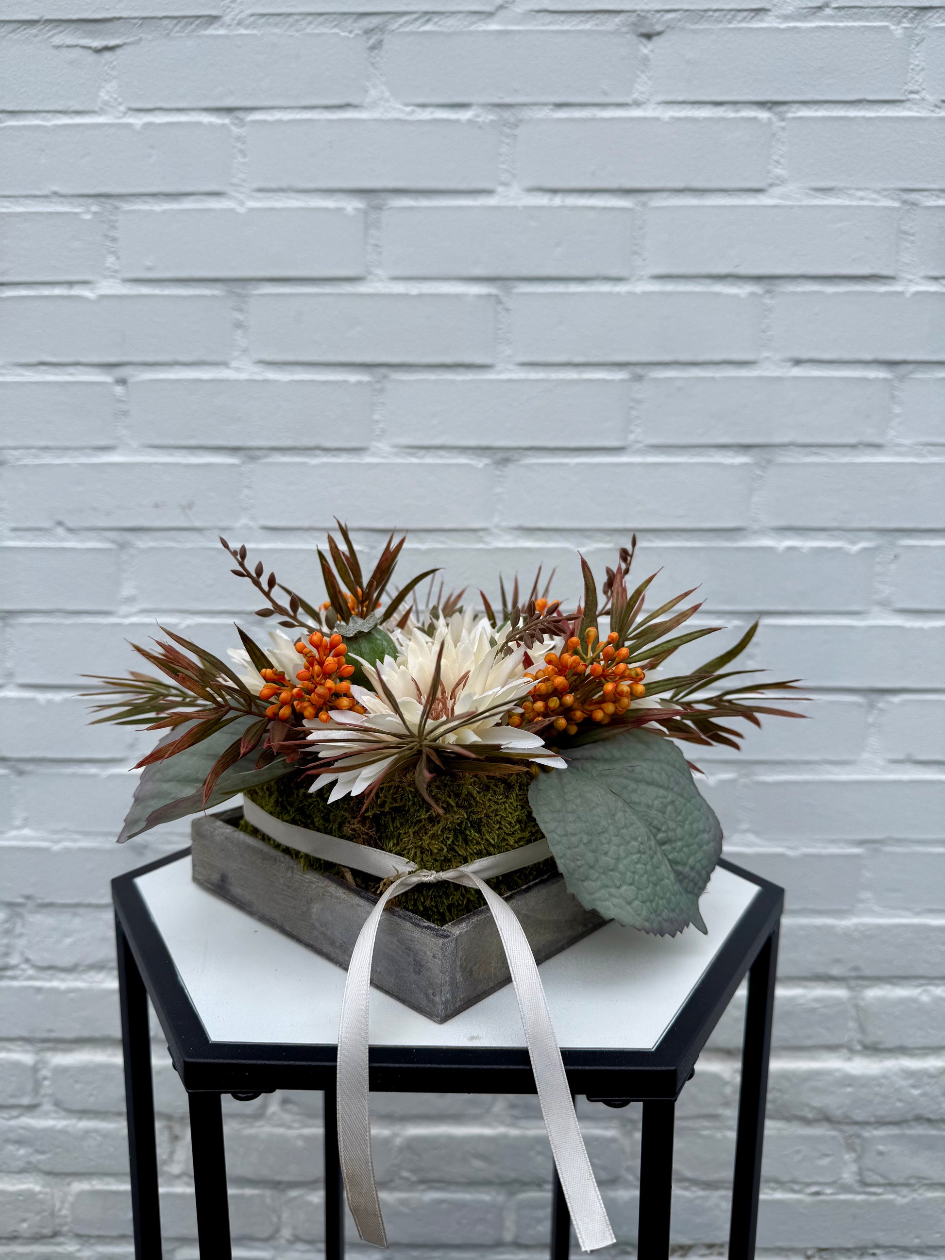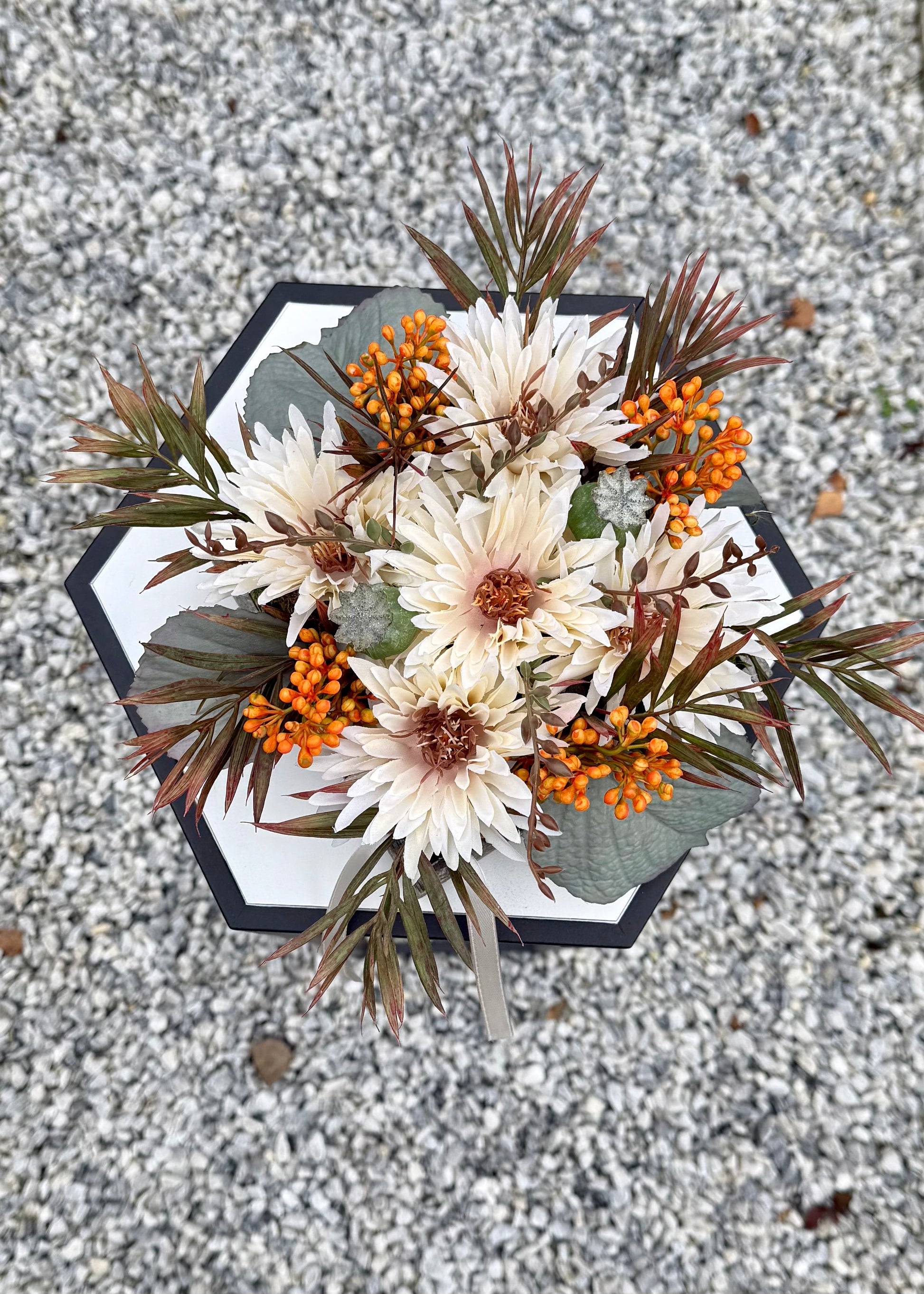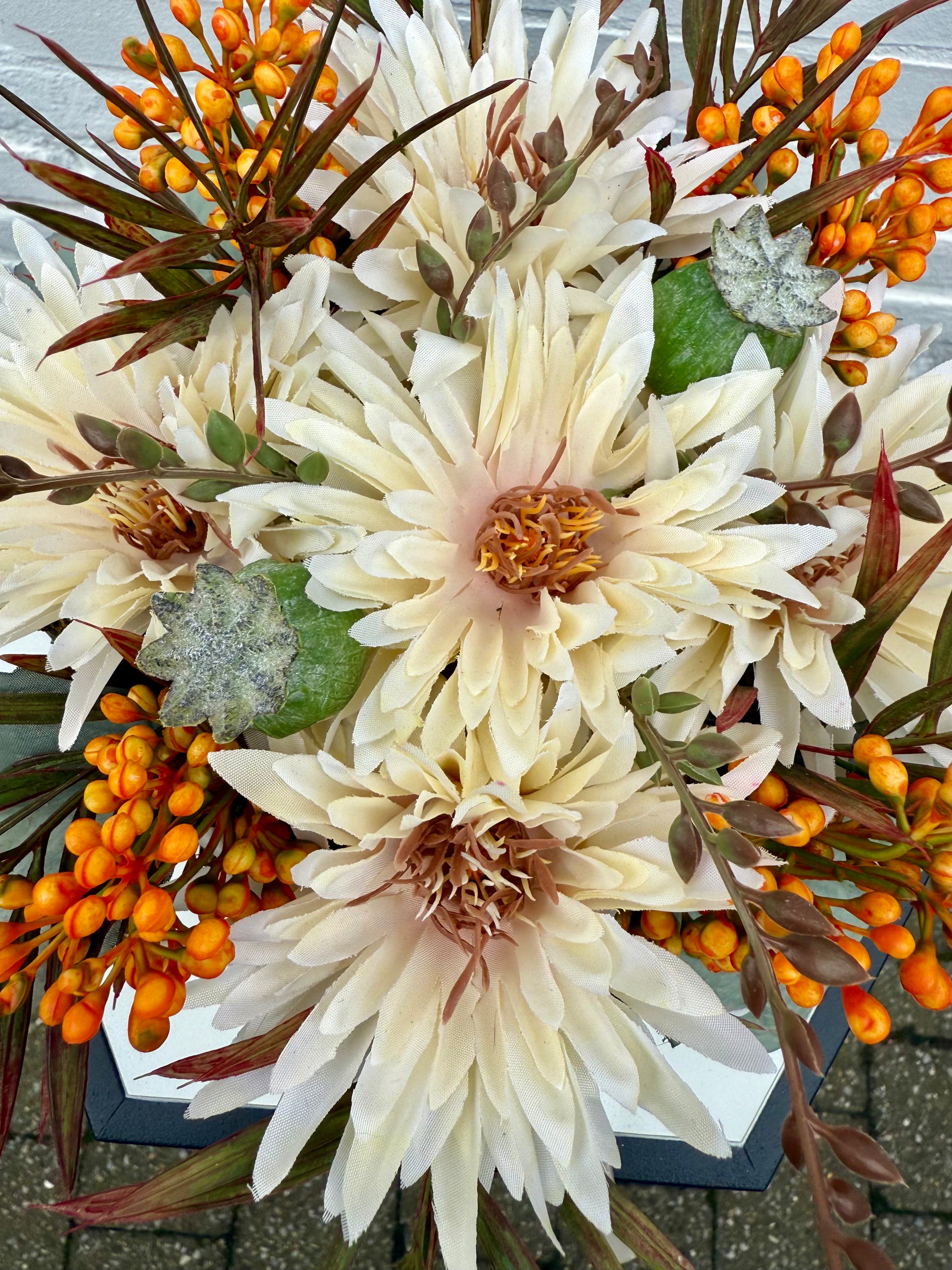 Dit grafstuk is met de hand gemaakt en volledig uniek: er bestaat maar één exemplaar van. Met zorg samengesteld uit hoogwaardige zijden bloemen/materialen en een eigen ontwerp, zodat het een bijzonder en persoonlijk eerbetoon vormt aan uw dierbare