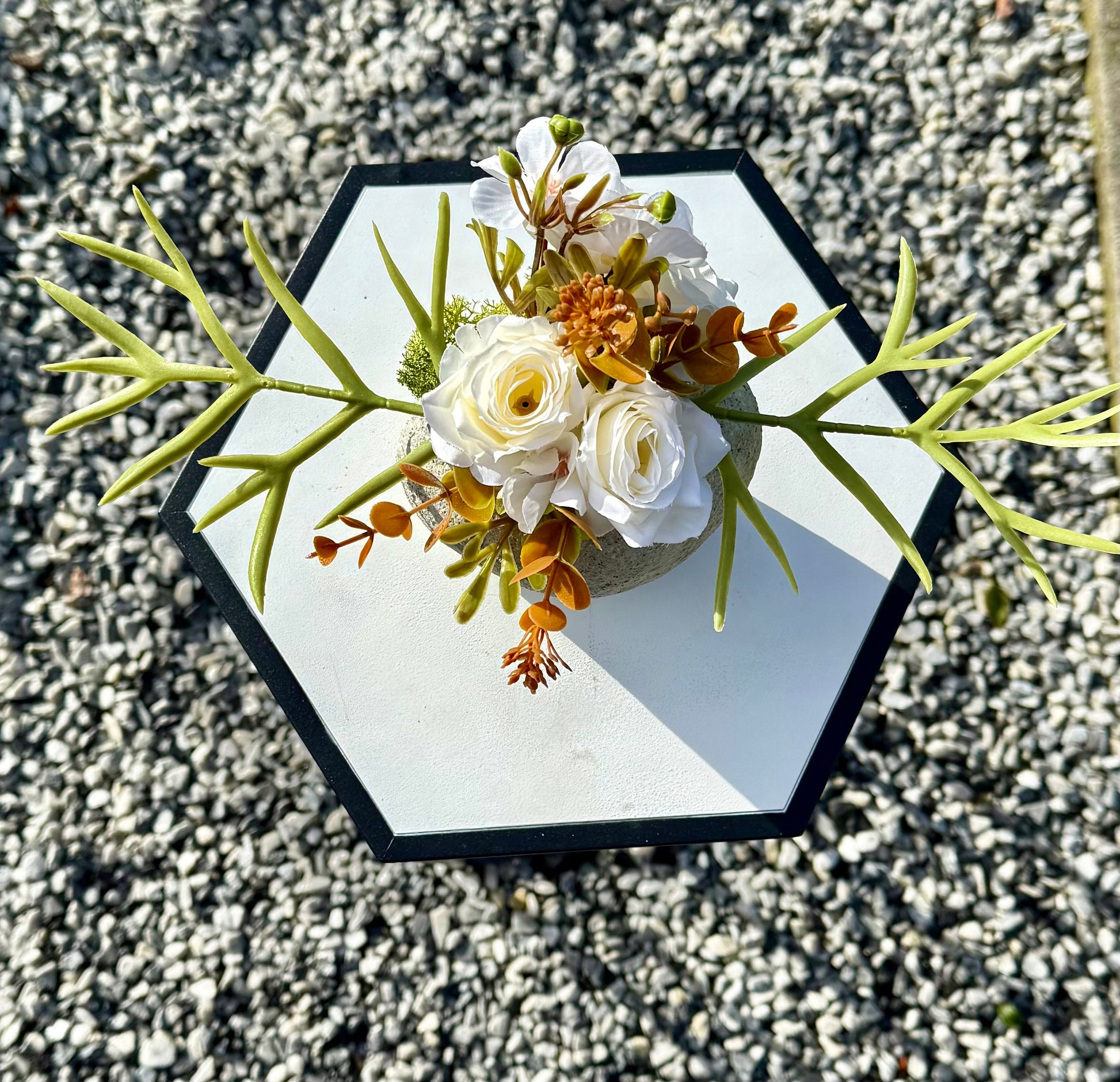 Dit grafstuk is met de hand gemaakt en volledig uniek: er bestaat maar één exemplaar van. Met zorg samengesteld uit hoogwaardige zijden bloemen/materialen en een eigen ontwerp, zodat het een bijzonder en persoonlijk eerbetoon vormt aan uw dierbare