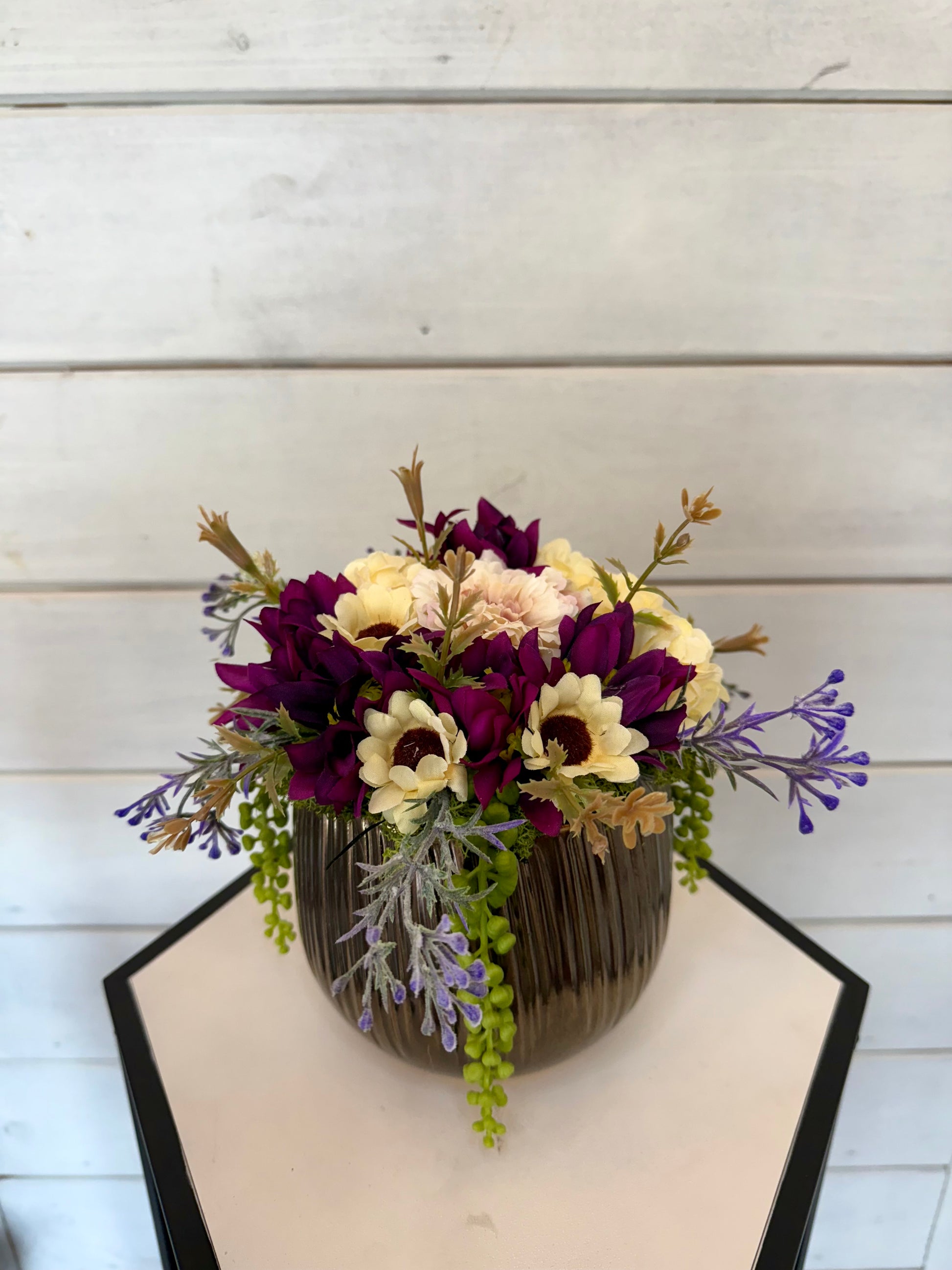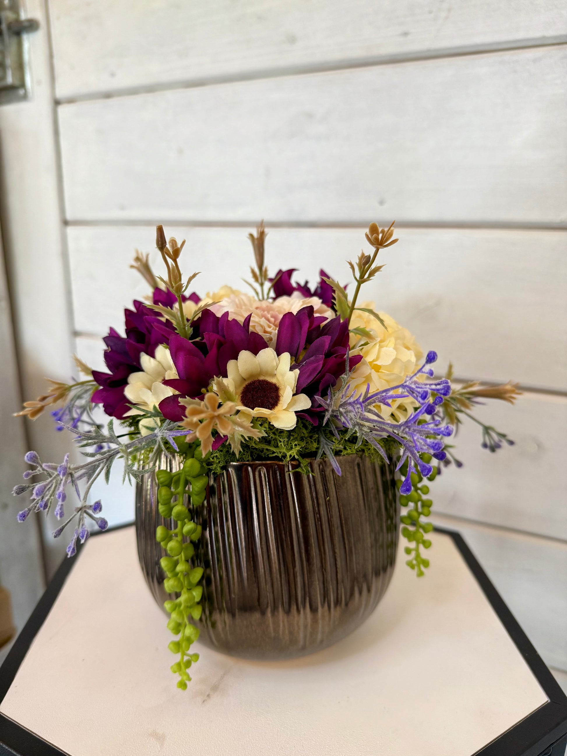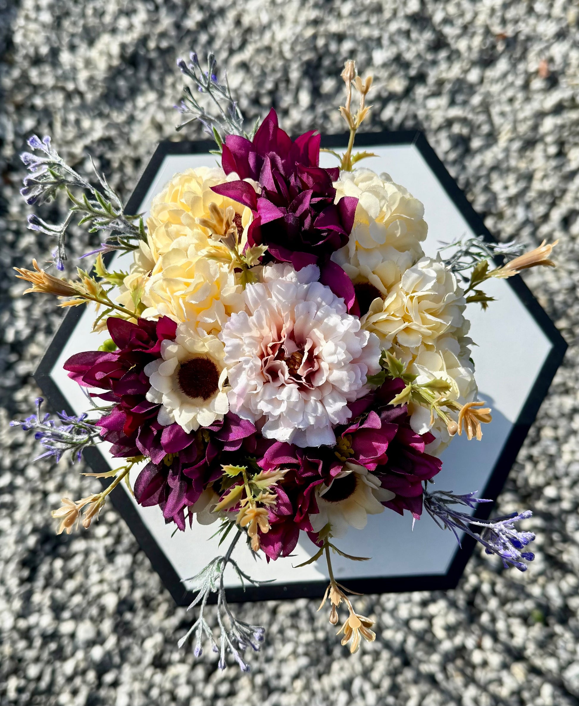Dit grafstuk is met de hand gemaakt en volledig uniek: er bestaat maar één exemplaar van. Met zorg samengesteld uit hoogwaardige zijden bloemen/materialen en een eigen ontwerp, zodat het een bijzonder en persoonlijk eerbetoon vormt aan uw dierbare