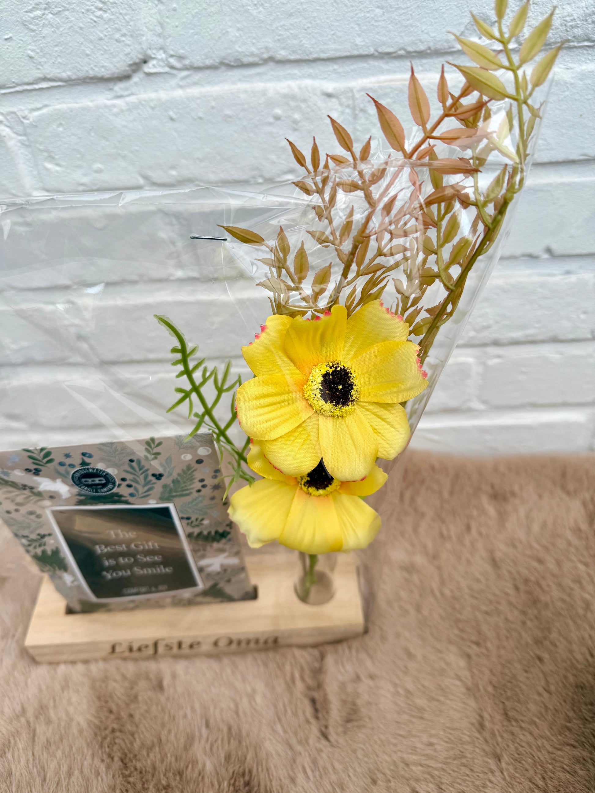 Deze houten staander is incl. Buisje met bloemen en met geurzakje