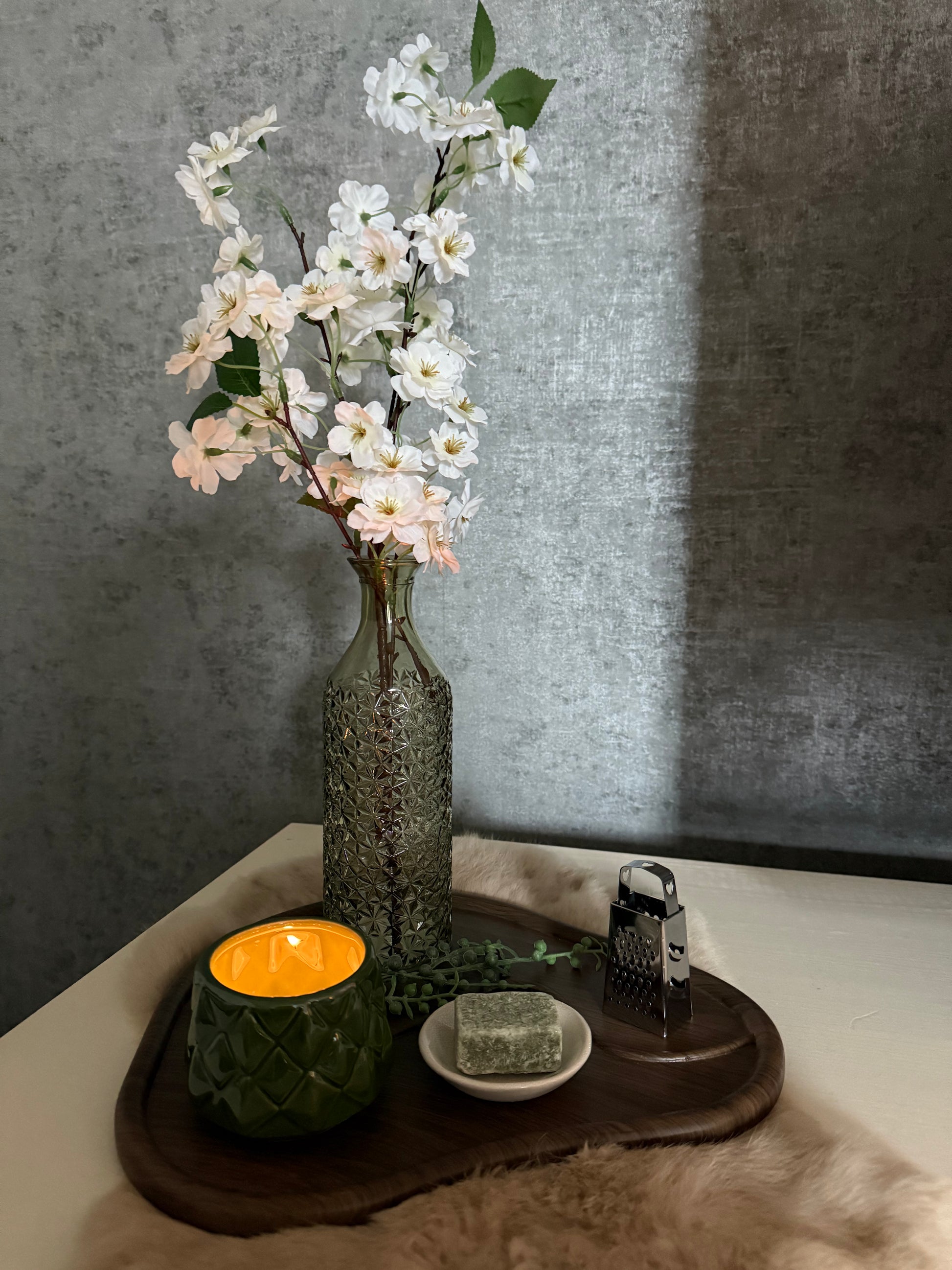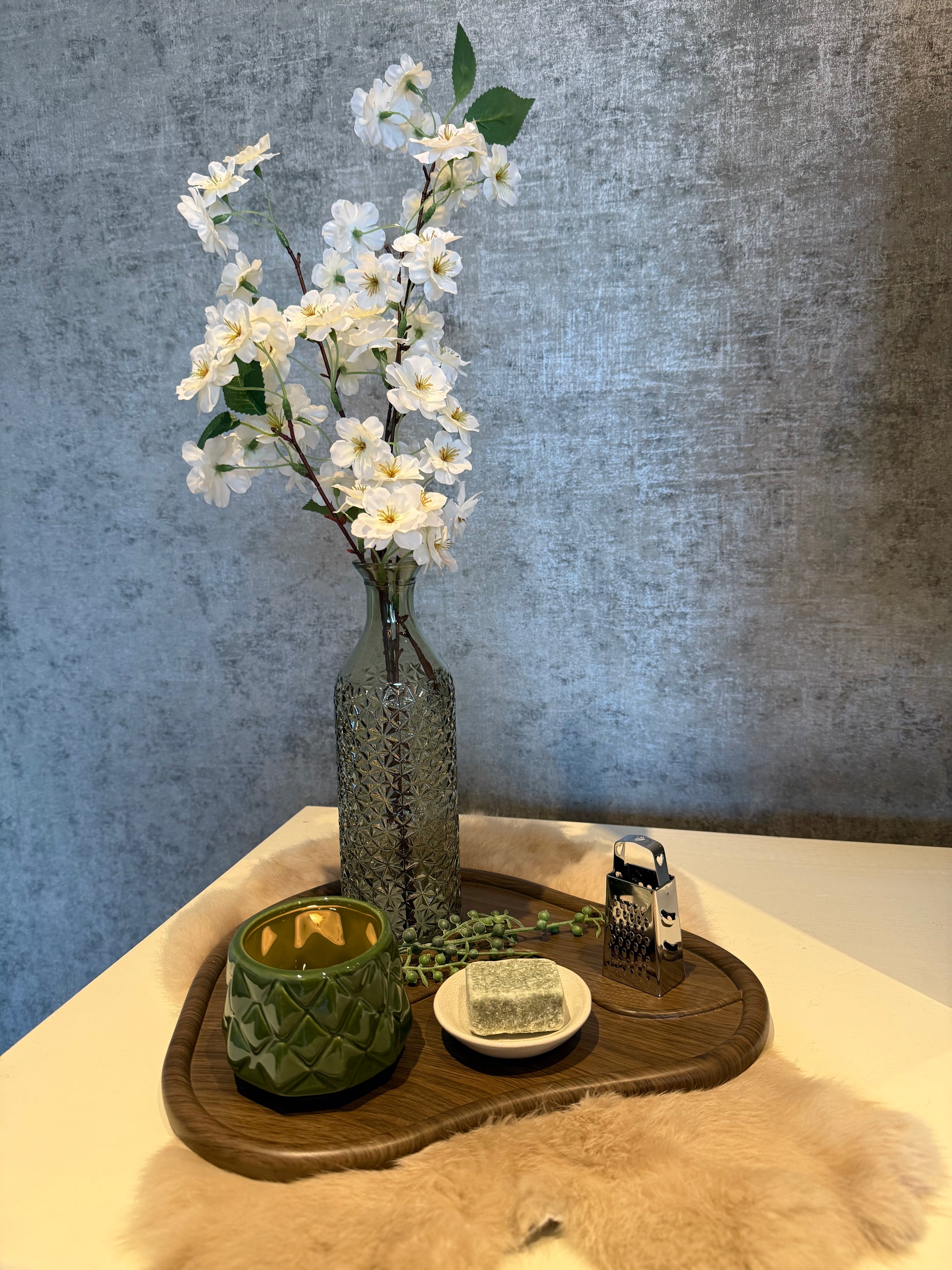 Breng warmte en stijl in je interieur met dit prachtig gestylede decoratieplateau. De combinatie van verschillende vormen, texturen en accessoires zorgt voor een harmonieus en sfeervol geheel. Het plateau creëert moeiteloos een knusse en elegante uitstraling die in elk interieur tot zijn recht komt.